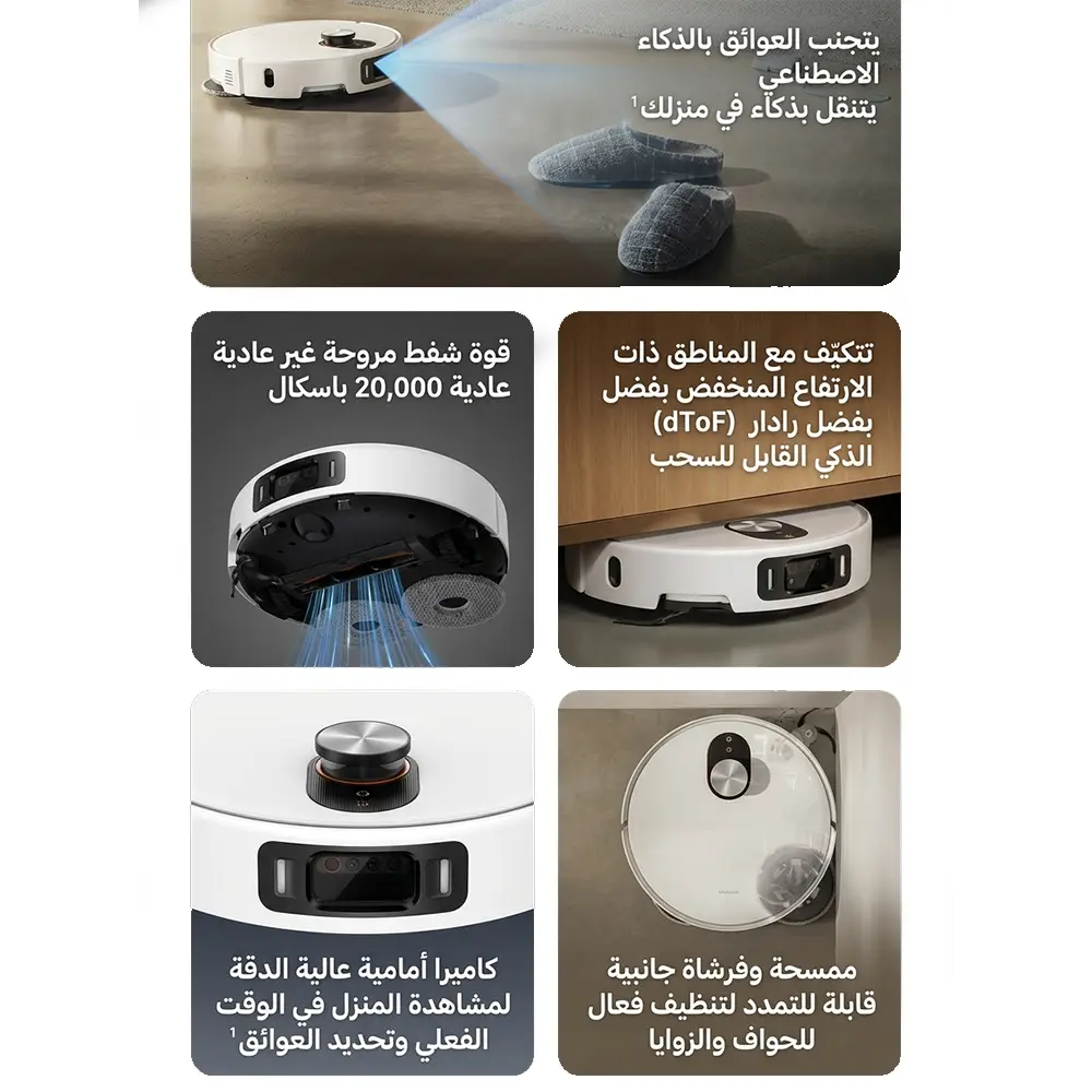 مزودة برادار ليزر قابل للسحب ينخفض تلقائياً عند الدخول تحت الأثاث، لتصل لأماكن بارتفاع حتى 9.5 سم بسهولة.